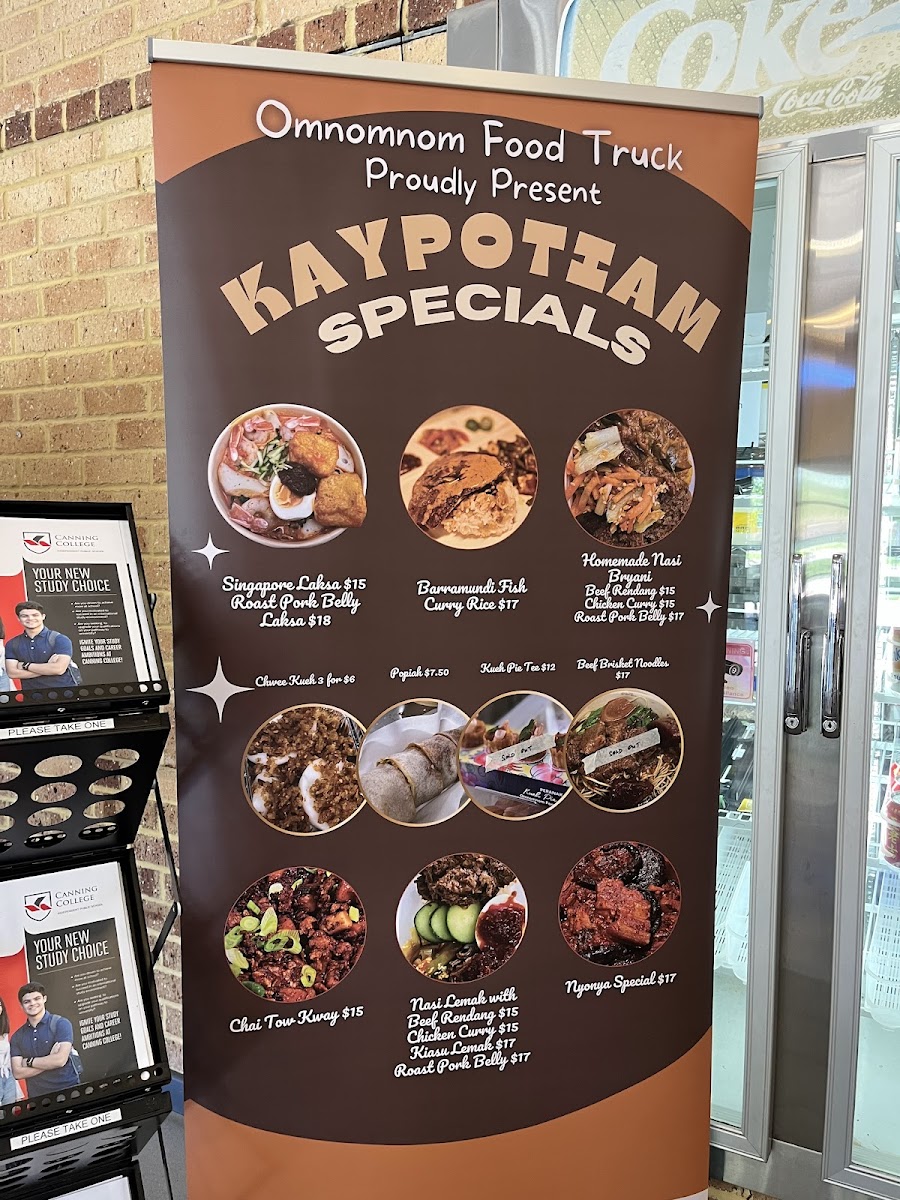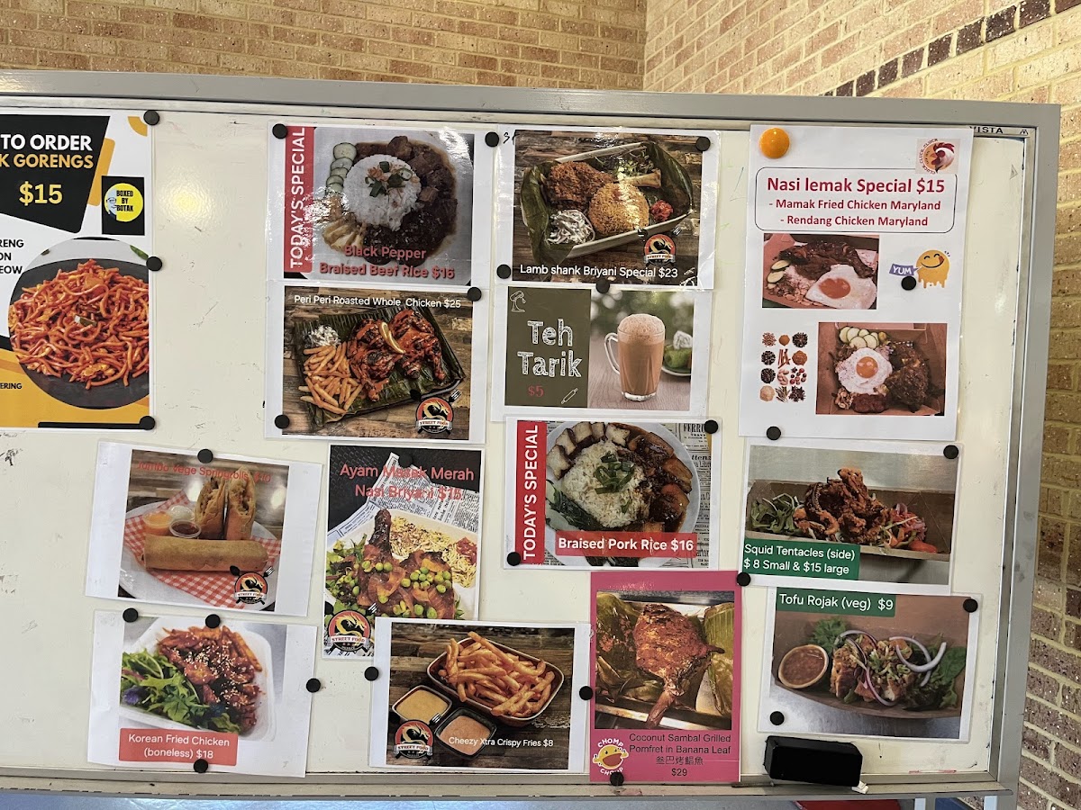 The menu highlights several regional specialties including Laksa, Combo B Chicken & Pork, Popiah, Mee Siam, Ayam Masak Merah, and Bak Chor Mee Mee Pok.